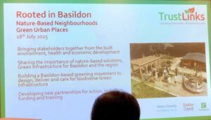 Much like its work with a local authority, Trust Links seems to have also thrived through building partnerships. Working with other organisations and individuals has enabled Trust Links to offer additional services, such as hosting training in horticulture and permaculture, for example. It also hosted the conference I attended entitled Developing Green Urban Spaces. I experienced this conference as an opportunity for Trust Links to inspire more activity in the field, and to facilitate connection between developing and developed eco-businesses, changemakers, investors, and others. This was additionally represented by the diversity of people presenting at the event, from seminal speakers on green infrastructure and environmental design, to alumni of the Nature-based Solutions Workshops. Even Basildon council’s Executive Director of Growth and Partnerships was there to present opportunities to improve local biodiversity and tackle climate change. There was a collective desire in the room that day to re-envision our relationship with nature, repositioning ourselves as within the natural world, and not apart from it. This was evident from the valuing of green urban spaces as vital for functions such as water drainage and heat absorption in buildings and on the earth. A range of green roofing pioneers and specialists were also there, such as Dusty Gedge and Chris Bridgman, sharing projects they had worked on and to present the human and ecological wellbeing that green spaces create.